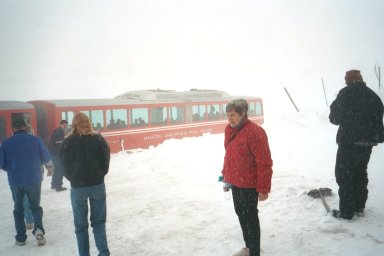 Pike's Peak in MayOf course, we had a little help that didn't exist in 1806. We rode to the top on the Manitou and Pike's Peak Railway. This Cog Railway was opened in 1891 and is the highest railway in North America and the highest cog (or rack) railway in the world. The pictures directly below show what the train looks like on a typical climb. Our trip took place during a snow storm.