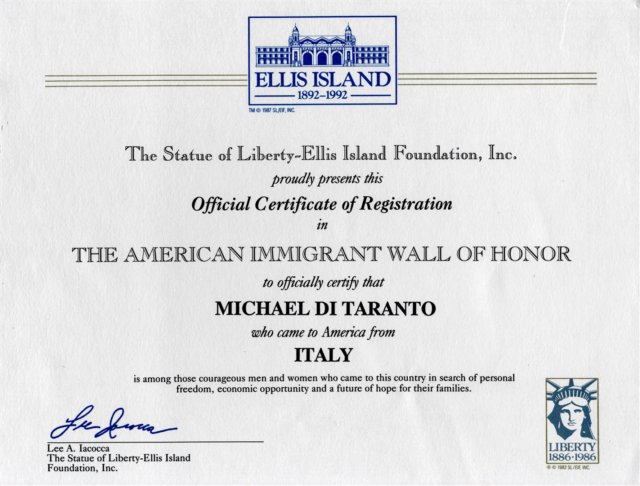 Ellis Island Wall of Honor certificate - Papa DiTaranto